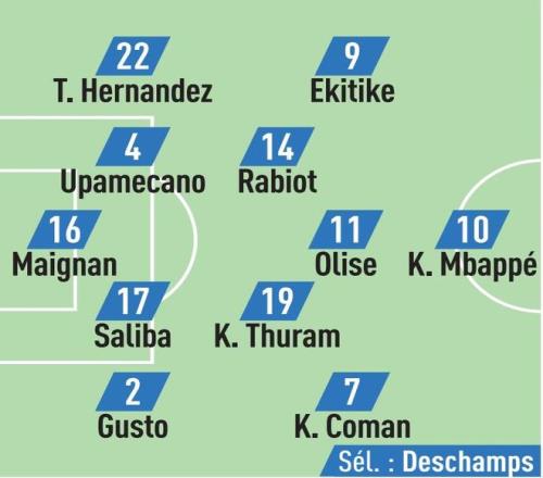 北京时间明天凌晨02:45,法国将迎来世界杯欧洲区预选赛第7轮主场对阵阿塞拜疆的比赛,赛前,《队报》对法国队的首发阵容进行了预测,其中姆巴佩、埃基蒂克、奥利塞在列。