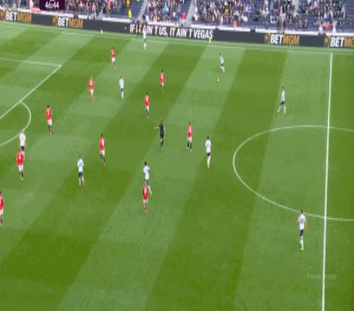 有进球,而且上半场带着1-0的比分进入更衣室,我们确实就没太多能说的了,毕竟我们也证明不了理论上的最高反制布置,是否也能带着领先的比分进入中场休息的时段。 但到了下半场,随着热刺输出的压力越来越大: