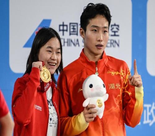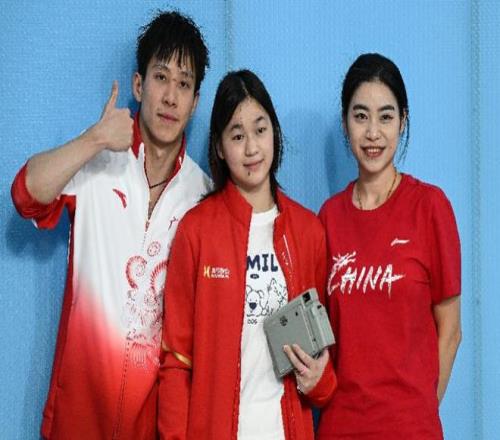 全红婵与人“比心”合影。 在颁奖仪式后,全红婵还调皮地挂着王宗源的金牌与人合影。